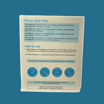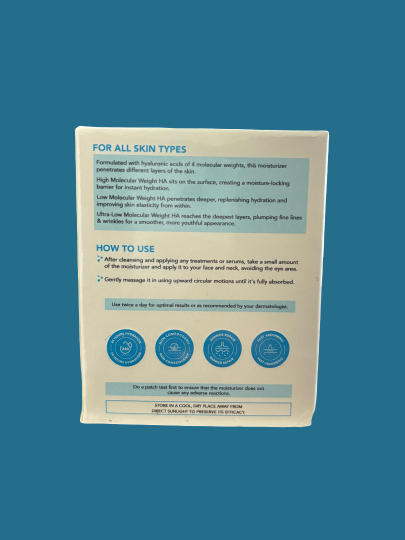 - Formulated with hyaluronic acids of 4 molecular weights, this moisturizer penetrates different layers of the skin.