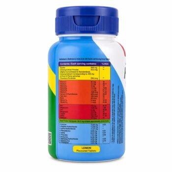 Taurine, Soya Protein Hydrolysate, Polyvinylpyrrolidone (INS 1201 & 1202), Microcrystalline Cellulose [INS (460 (i))], Ascorbic Acid, Ginseng Extract, Ferrous Fumarate, Croscarmellose Sodium (INS 468), Sodium Starch Glycolate, Stearic Acid (INS 570), HydroxyPropyl Methylcellulose (INS 464), Vitamin E Acetate, Zinc Sulphate, Niacin, Light Magnesium Oxide, Colloidal Silicon Dioxide (INS 551), Vitamin A Acetate, Manganese Sulphate, Ergocalciferol, Vitamin B6, Cupric Sulphate, Vitamin B2, Vitamin B1, Calcium D-Pantothenate, Chromium Picolinate, Potassium Iodide, Folic Acid, Biotin, Sodium Selenate, Cyanocobalamin, Talc [INS 553(iii)], Sodium Carboxymethyl Cellulose (INS 466), Maltodextrin, Dextrose Monohydrate, Lecithin [INS 322 (i)].